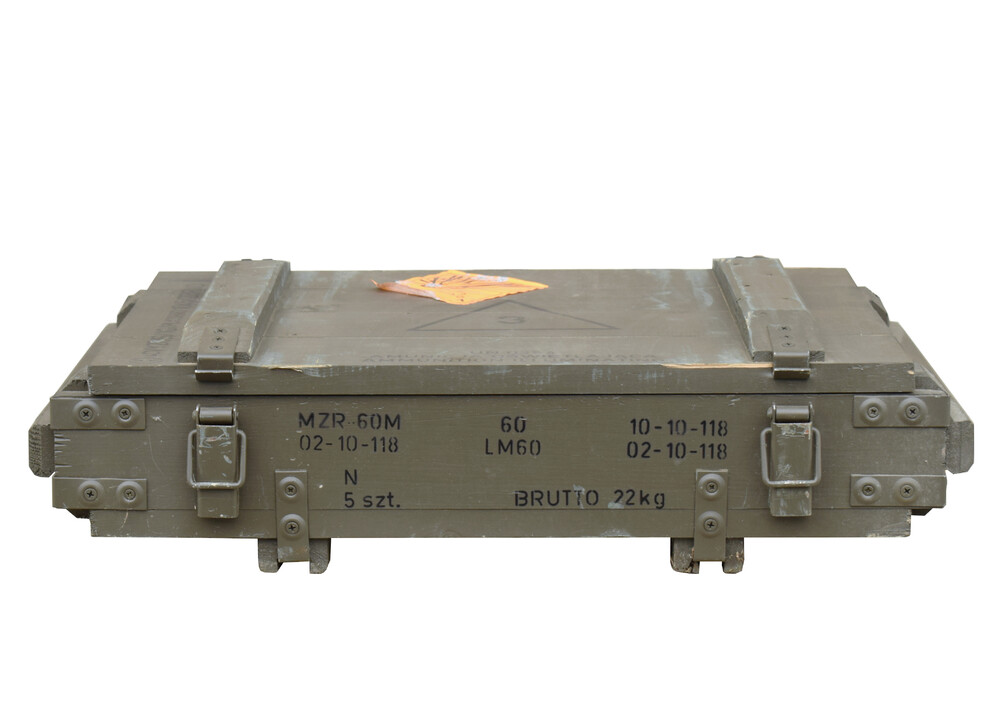 Drewniana skrzynka wojskowa w kolorze zielonym po polskich moździerzach kaliber 60mm zwanych LM60.  Skrzynia zamykana na dwie metalowe klamry, po bokach posiada uchwyty transportowe. Metalowe okucia podkreślają wytrzymałość skrzyni